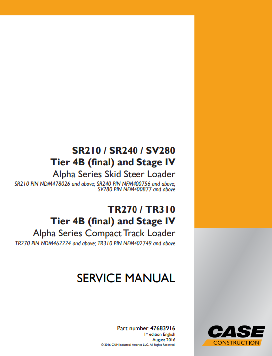 Case SR210, SR240, SV280, TR270, TR310 Skid Steer Service Repair Manual