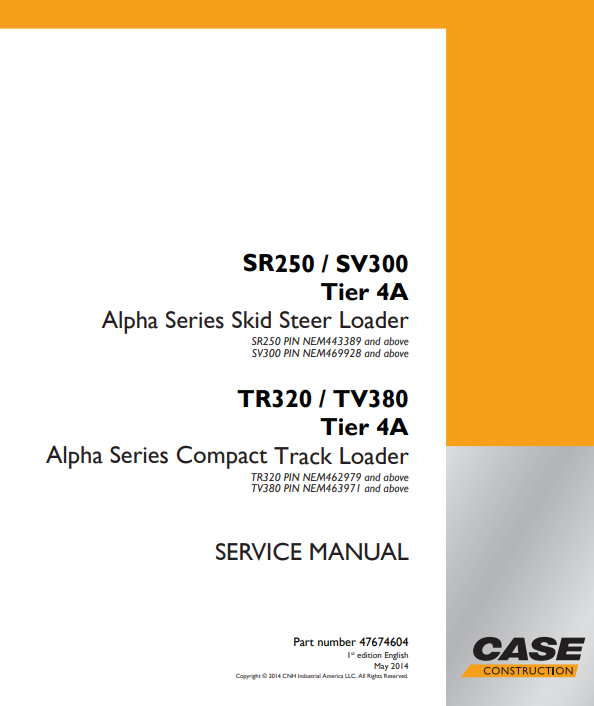 Case SR250, SV300, TR320, TV380 Skid Steer Service Repair Manual