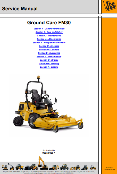 Original Factory Service Repair Manual for the JCB Ground Care FM30 Front Mower. This manual is very detailed and contains all the official JCB manufacturer specifications, troubleshooting, repair instructions step by step with illustrations and wiring diagrams. Simple to complicated repairs can be completed effortlessly with the information provided. It is 100 percent complete and intact. The manual is specifically written for the DIY as well as the experienced mechanic
